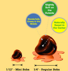 | Boba, is also known as black pearls or tapioca balls, is derived from the starch of the cassava root. When cooked perfectly, the Boba becomes a sweet chewy ball with a gummy-bear like texture about 1/4 of an inch in diameter. |